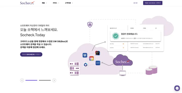 Socheck 서비스로 들어오시게 되면 우측 상단에 [무료로 쏘책 시작하기] 버튼이 있습니다.