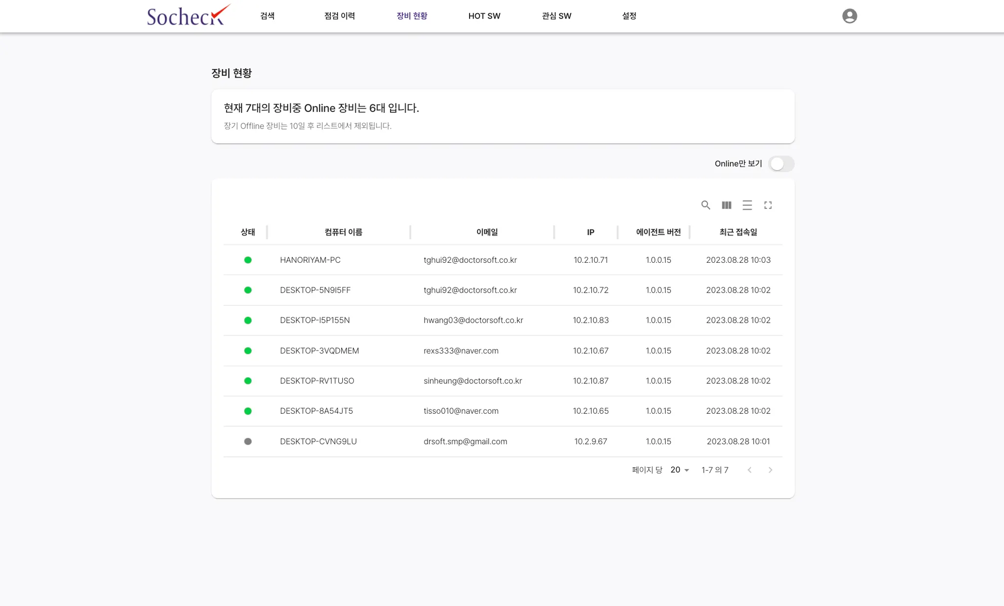 목록에는 크게 상태, 컴퓨터 이름, 사용자를 식별할 수 있는 이메일과 IP 주소, Agent 버전, 최근 접속 일을 확인하실 수 있습니다.