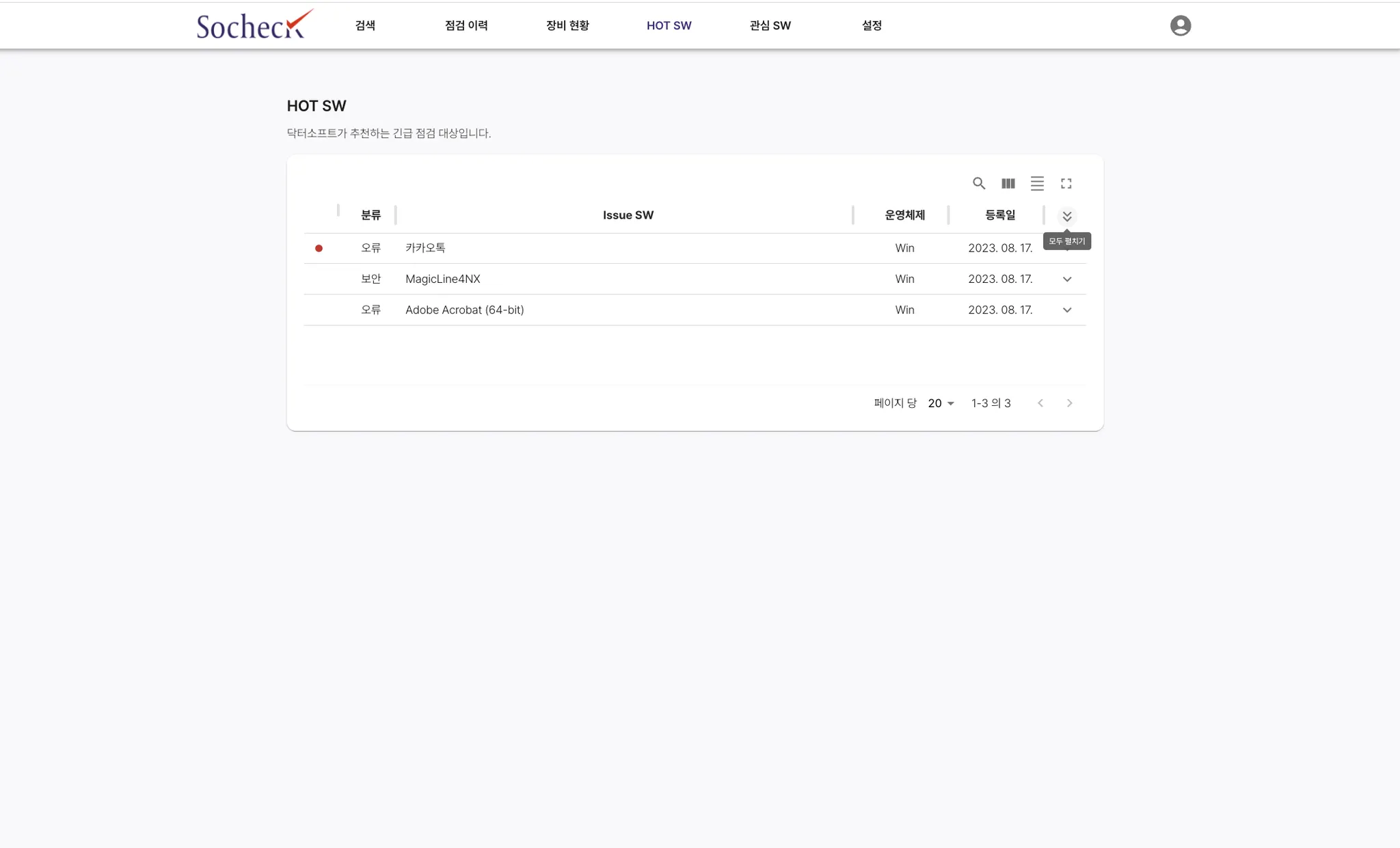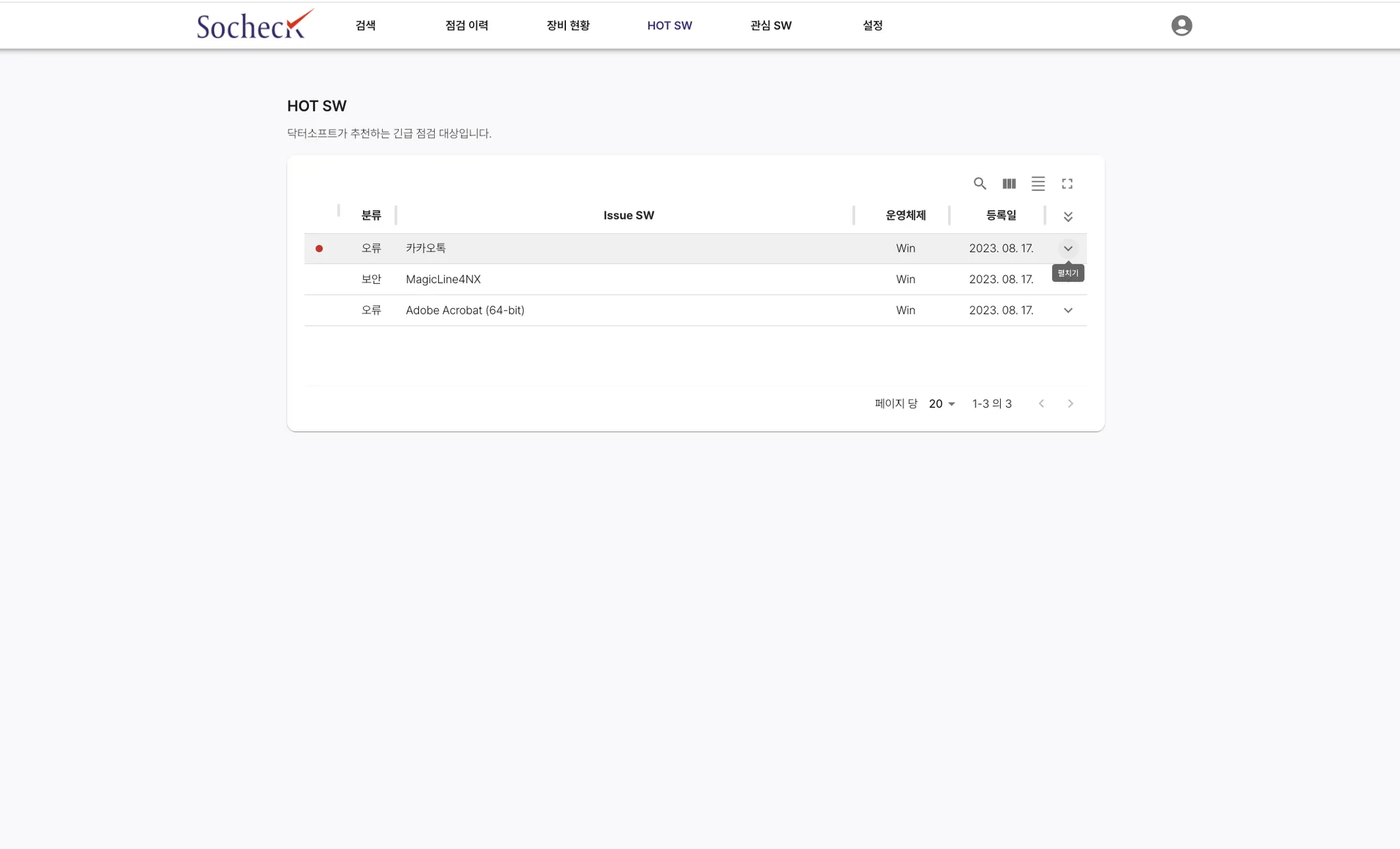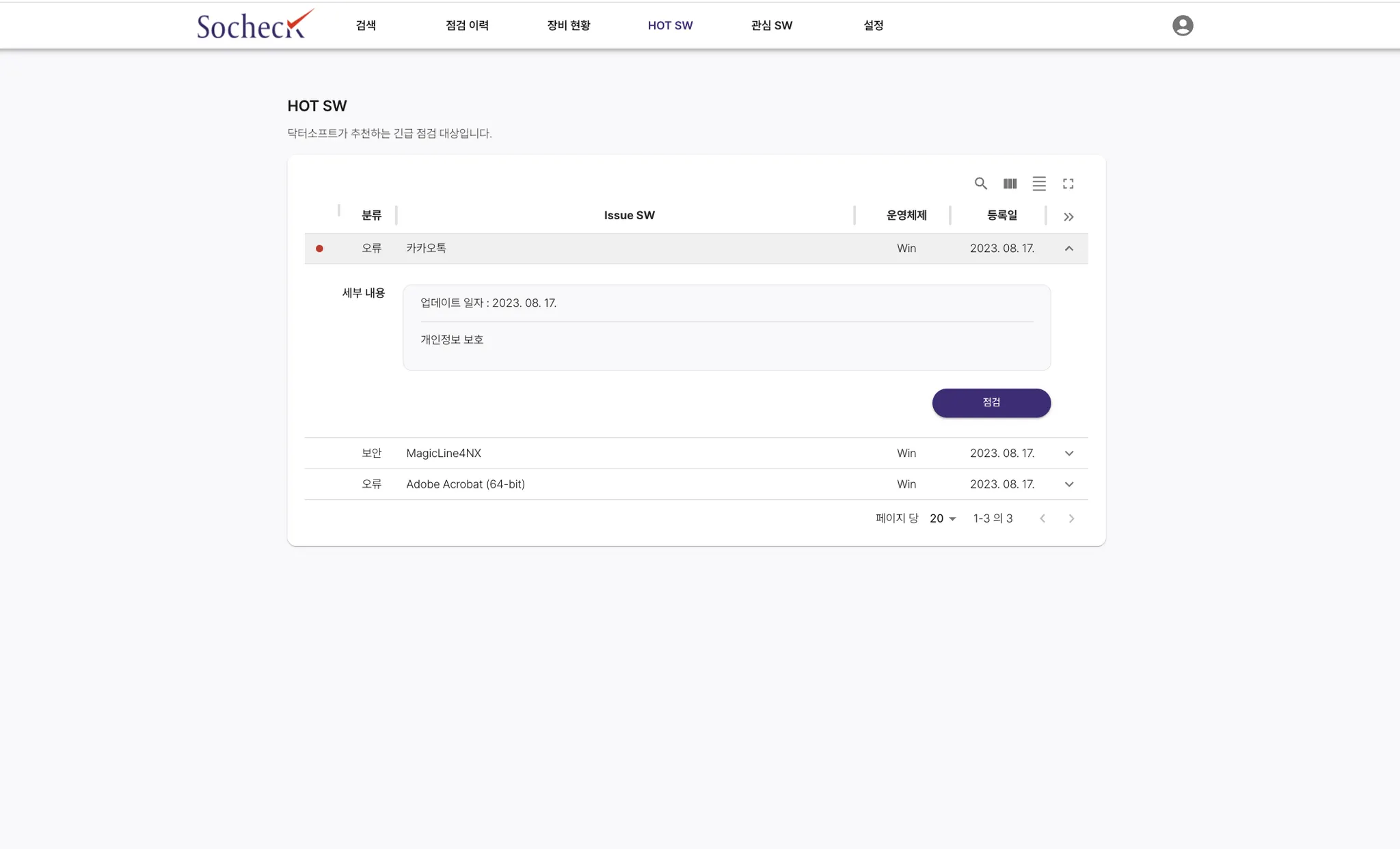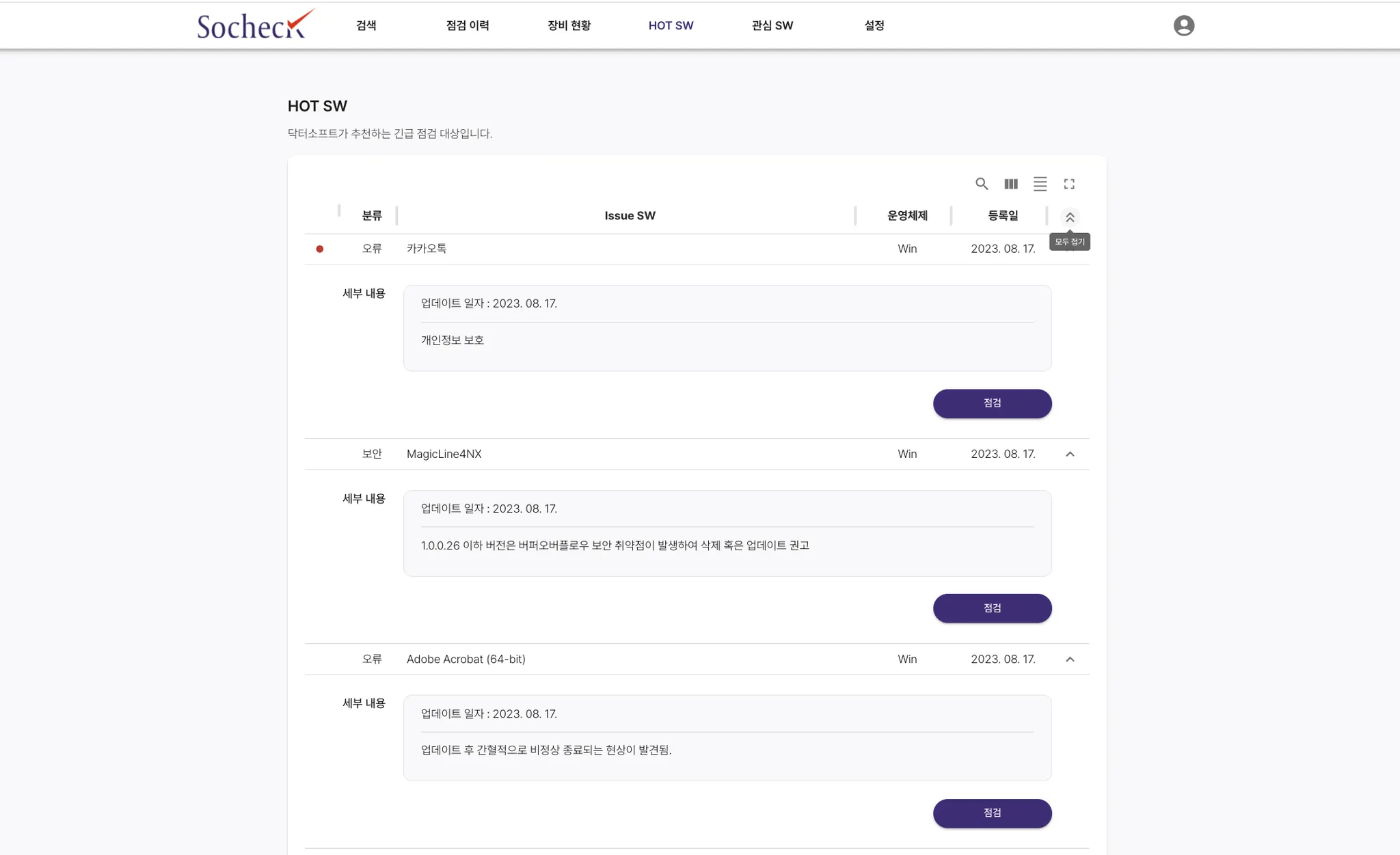 이 아이콘을 클릭하면 세부 내용이 펼쳐집니다. 그럼 해당 SW가 HOT Issue가 된 내용과 함께 점검 버튼을 확인하실 수 있습니다.