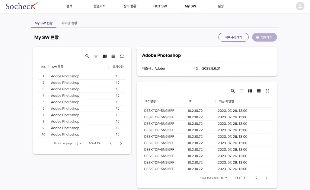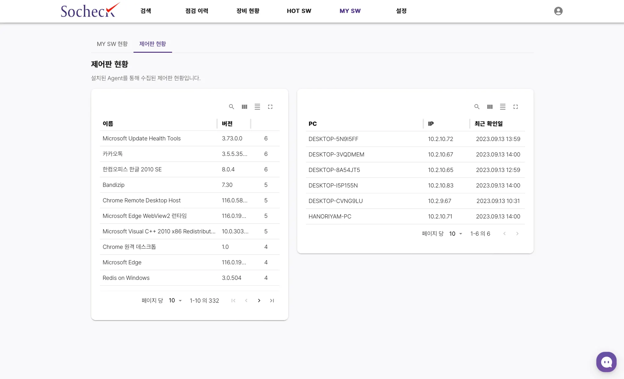 우측 목록에서는 좌측 SW 목록을 기준으로 특정 SW가 설치된 사내 장비들을 확인할 수 있어요.